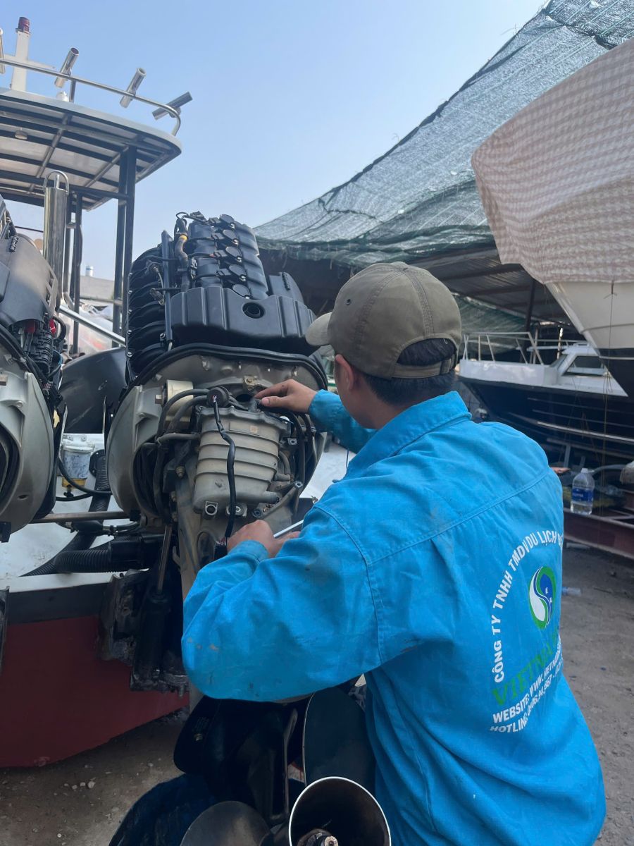 Quy trình sửa chữa chuyên nghiệp bao gồm kiểm tra tổng thể, đo vòng tua, kiểm tra nhiên liệu, chân vịt và hệ thống làm mát. Sau đó tiến hành sửa chữa và chạy thử thực tế.